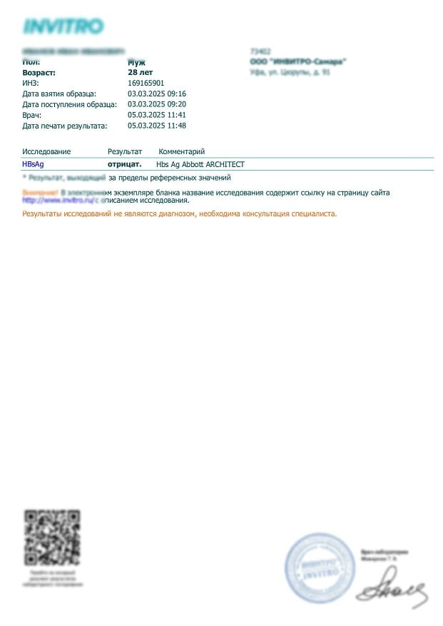 Справка Анализ крови на гепатит B